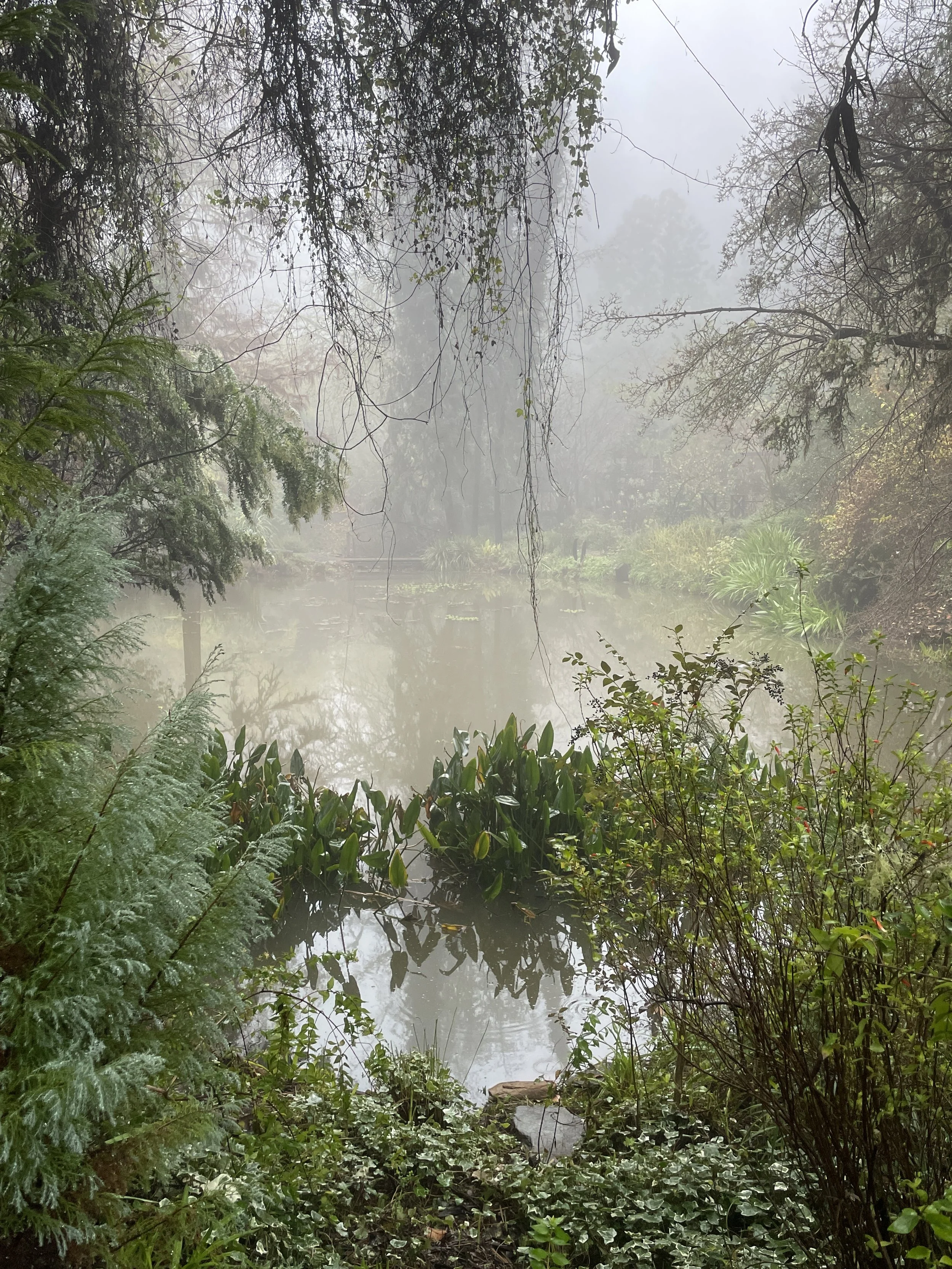 The garden includes five ponds, 34 bridges, a magnificent folly inspired by the British garden designer Penelope Hobhouse, rare conifers, a camellia forest, endangered Chinese maples, dozens of fern varieties, and perennial shrubs as far as the eye can see. Two garden cats named Spot and Squeaky Panchito roam the property. Abundant frogs share their songs, and river otters make the occasional appearance.