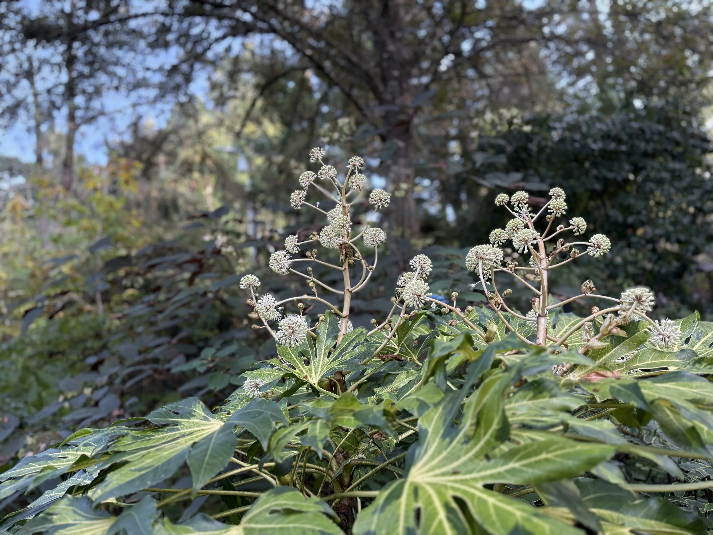 The higher humidity of our coastal location allows us to grow plants from South American neotropical biomes. Our coral tree (Erythrina crista-galli) was planted in the mid-1960s and has plentiful red flowers in the summer for hummingbirds to enjoy. Numerous iochroma plants from Bolivia and Peru, as well as monkey hand trees (Chiranthodendron pentadactylon) from southern Mexico and Guatemala, populate the garden.