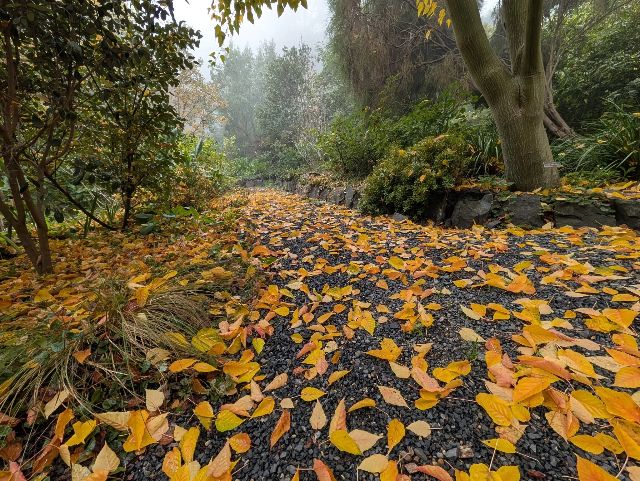 As the December days become shorter and shorter, the architecture of Western Hills emerges. This year’s early rainstorms brought full runnels and rushing waterfalls. Quilts of yellow leaves and bald cypress needles blanketed the paths. And the shapes of the vistas shifted, opening up new viewpoints through empty tree branches.